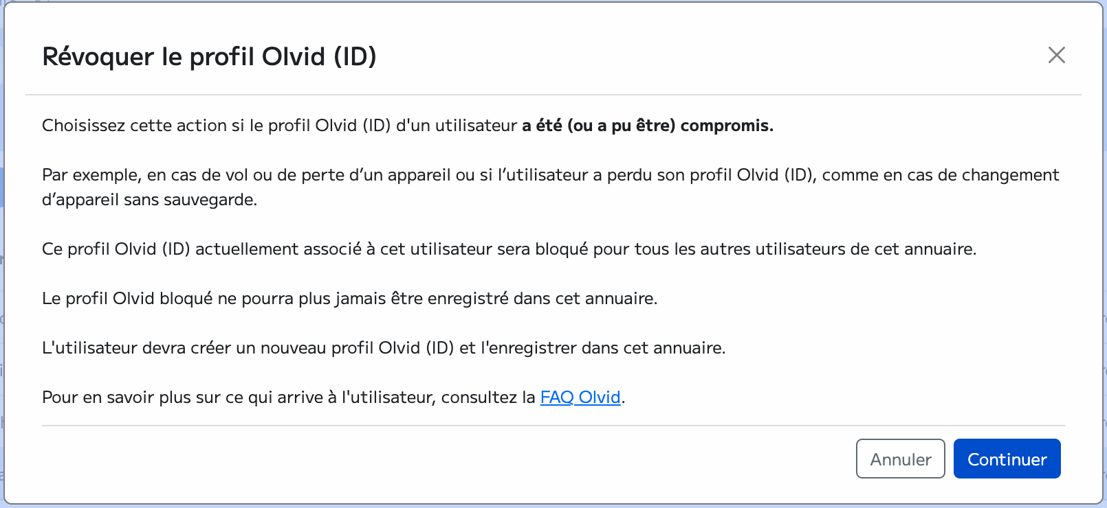 SĂ©lectionnez RĂ©voquer un profil Olvid (ID) si lâIDentitĂ© Olvid dâun utilisateur a Ă©tĂ© (ou pourrait avoir Ă©tĂ©) compromise, par exemple, en cas de vol ou de perte dâun appareil ou si lâutilisateur a perdu son IDentitĂ©, notamment lors dâun changement dâappareil sans transfert de profil ou sans restauration dâune sauvegarde.