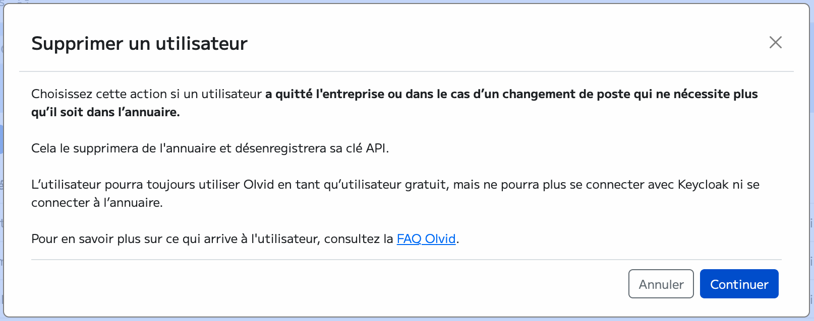 Lâutilisateur pourra toujours utiliser Olvid en tant quâutilisateur gratuit, mais ne pourra plus se connecter avec Keycloak ni se connecter Ă lâannuaire.