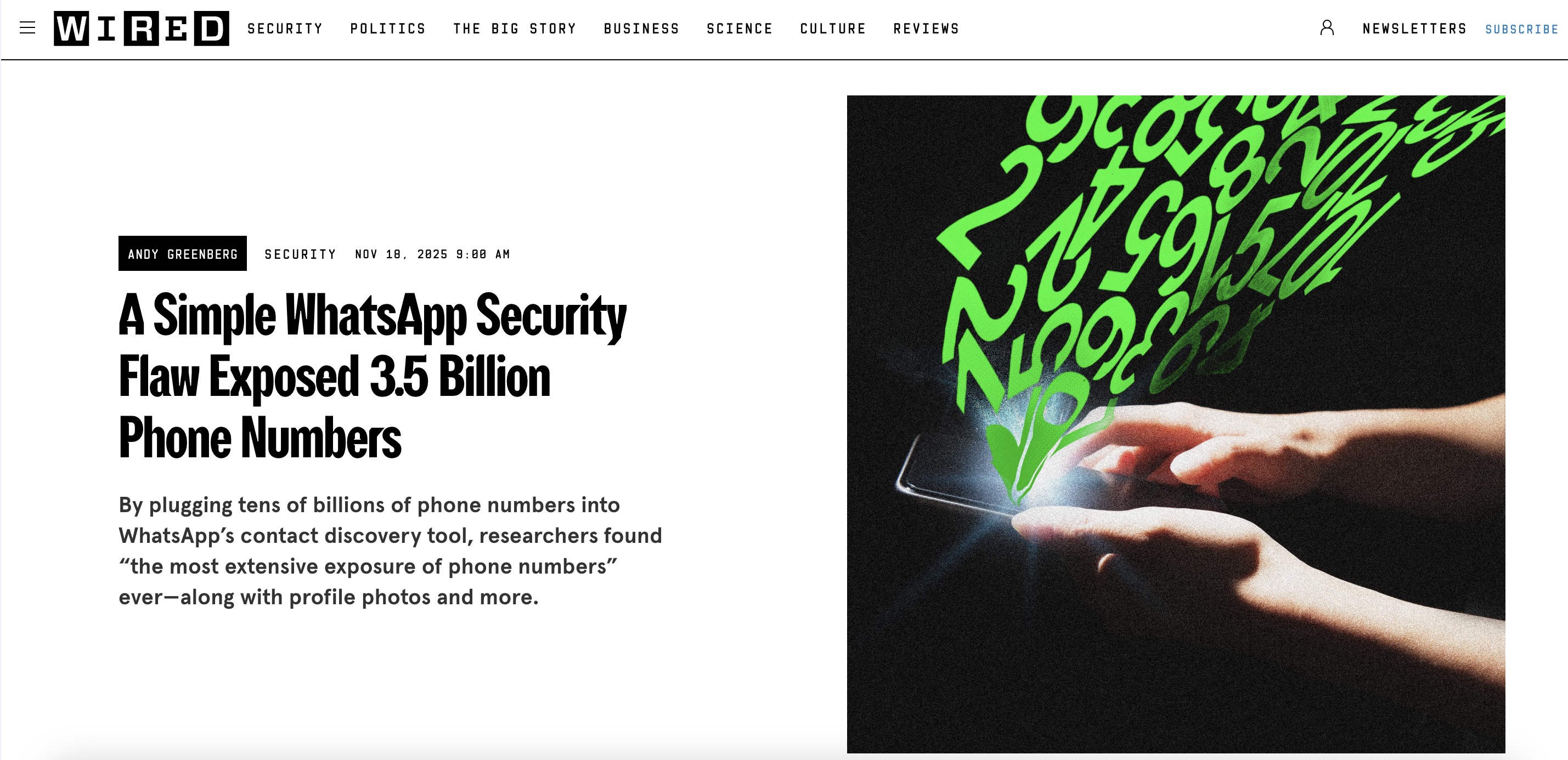 Researchers probed 3.5 billion phone numbers. How? By querying WhatsApp’s user directory. This exposes users to spam, phishing, and targeted attacks.